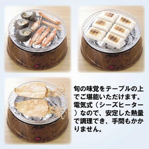 ●てがるに網焼き晩酌!お餅もこんがり! ●電気で安全! テーブルで網焼きができる「内食」の達人! 何度も台所に行かなくても、 卓上で・目の前で手軽に 焼いたり焙ったりが可能!卓上電気コンロ