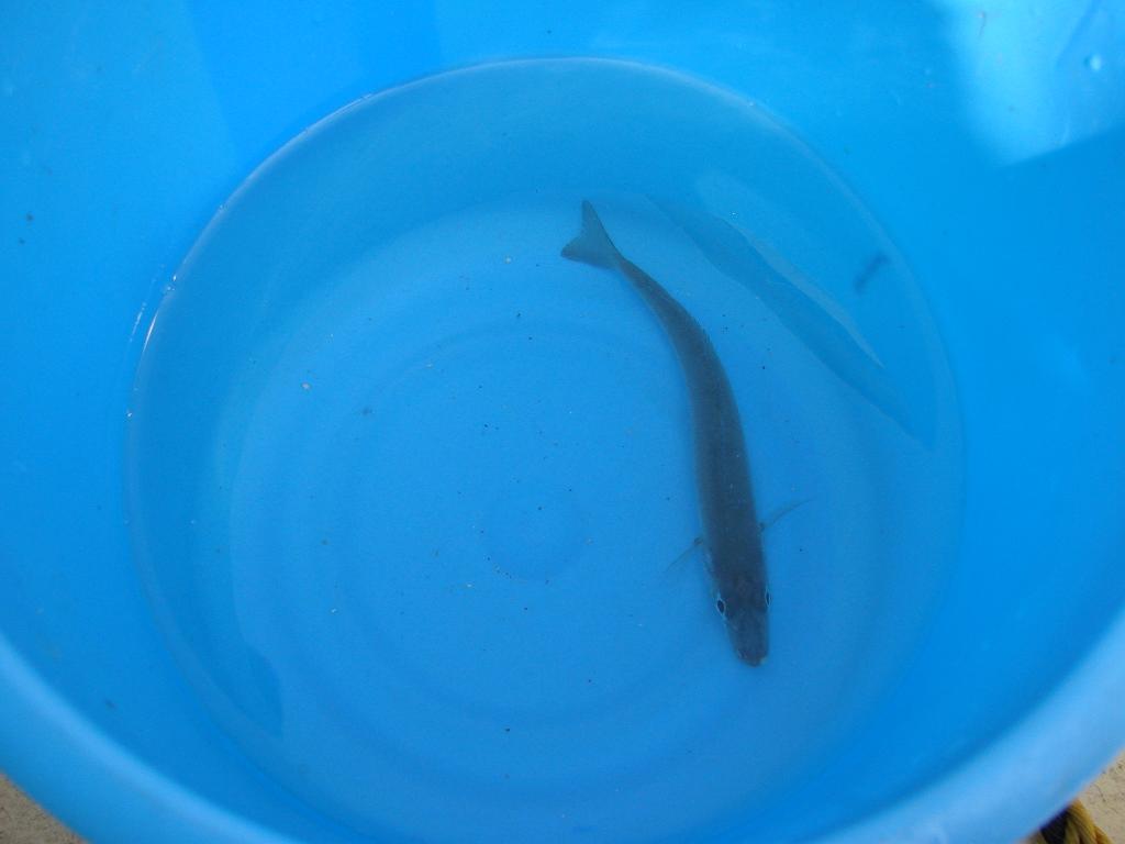 お昼におにぎり2個食べてから体調もよくなり、釣りに没頭し始め2匹を1度にゲット、しかしハリスが食いちぎられることが続く。フグに多分食われているとのことで仕掛けがどんどん無くなっていく始末。