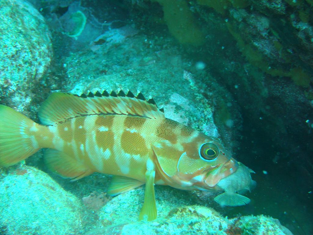 写真は、アカハタがカワハギを捕食した写真です。